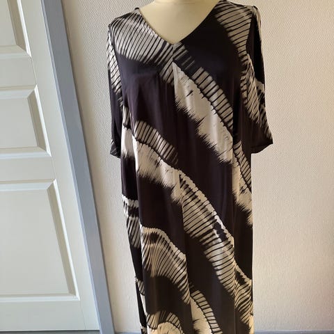 Culture hverdagskjole til kvinder i str. L. Kjolen er fremstillet i viskose og har et multifarvet mønster med prikker i blandt andet rød, pink og gyldne nuancer på mørk bund. Modellen har lange ærmer og V-udskæring samt knæ- til midilængde, egnet som hverdagskjole eller til mere afslappede anledninger.