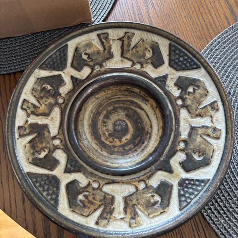 Søholm stentøjsfad i rund form. Fadet er udført i brunt stentøj med drejet spiral- og mønsterdekoration på oversiden. Undersiden er mærket med Søholm, Bornholm Denmark, modelnummer 5262 samt håndlavet-stempel. Velegnet som serveringsfad eller dekoration i hjemmet.