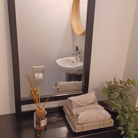 spejl med træramme og blå mosaikfliser langs siderne. Trærammen kombineret med de blå flisedetaljer giver et enkelt, dekorativt udtryk, der passer ind i mange indretningsstile.