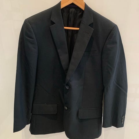 H&M blazer til herre i sort polyester, størrelse 52. Blazeren har klassisk revers, to forlommer med klap og en brystlomme. Indvendigt er der foret med glat materiale samt flere inderlommer. Materialet er hovedsageligt polyester med lidt elastan for bevægelighed. Velegnet som del af jakkesæt eller som enkel blazer til pænt brug.