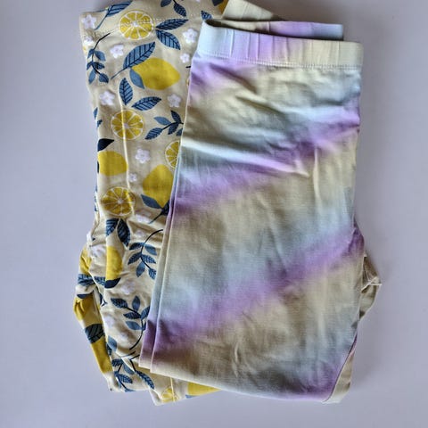 H&M leggings til pige i str. 140. Sættet består af to par bomuldsleggings i multifarvede mønstre, herunder sommerfugle og regnbuer. Elastik i taljen for komfortabel pasform. Velegnet til hverdagsbrug og leg.
