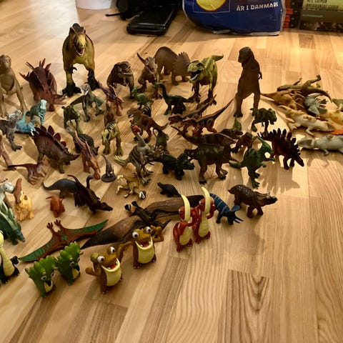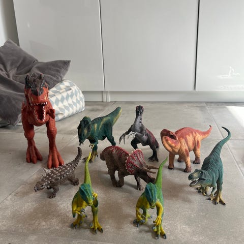 Dinosaur legetøjssæt bestående af flere dinosaurfigurer, menneskefigur, køretøj og forskellige legepladser/bygninger. Sættet omfatter blandt andet plastdinosaurer i forskellige størrelser og farver, et blåt køretøj, løse dele til bygninger og klippeformationer samt samlevejledning. De enkelte dele kan samles til forskellige scener med dinosaurer, ramper og klipper. Egnet som legesæt til børn, der kan bygge og ombygge miljøer til dinosaurleg.