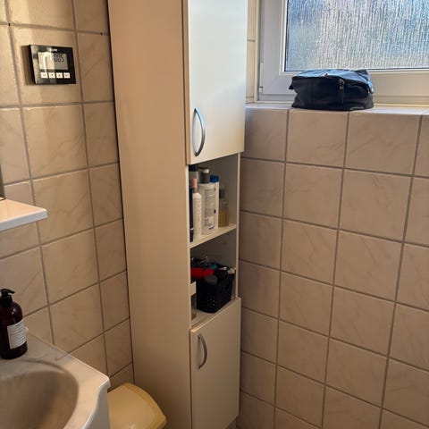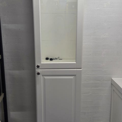 Højskab til badeværelse i sort. Skabet er højt og smalt, med låger og indvendige glas hylder og skuffe til opbevaring. Egnet til montering på badeværelse eller i bryggers til opbevaring af håndklæder, toiletartikler og rengøringsmidler. Leveres med låger og hylder som vist på billederne.