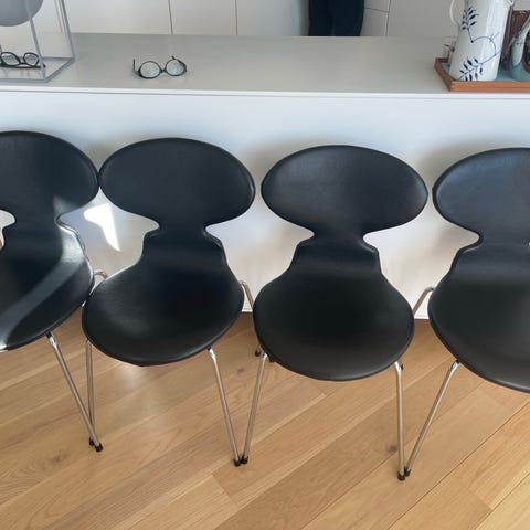 Fritz Hansen stol designet af Arne Jacobsen. Klassisk skalstol i sort med kromstel, velegnet som spisebordsstol eller kontorstol. Formen giver god støtte i ryggen, og det enkle design passer ind i mange typer indretning. Stolen er udført i formspændt skal med slanke metalben.