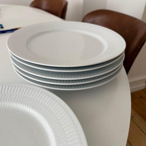 Royal Copenhagen tallerkener i hvidt porcelæn. Klassiske, runde middagstallerkener med rillet kant. Egnet til daglig brug i køkken og spisestue. Kan anvendes som spise- eller serveringstallerkener afhængigt af behov. Designet passer ind i mange typer stel og borddækninger.