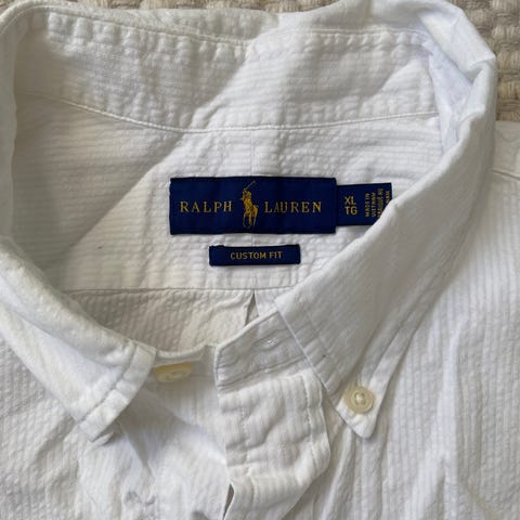 Ralph Lauren Custom Fit herreskjorte i størrelse XS. Der står SP i størrelse og det svarer til small petit. Skjorten er i blå og hvid stribet bomuld med klassisk krave og knaplukning foran. Brystet har det velkendte Ralph Lauren-logo broderet. Materialet er 100 % bomuld, som giver en let og behagelig pasform. Velegnet som hverdagsskjorte eller til mere formelle lejligheder.