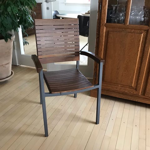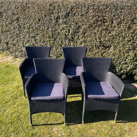 6 havestole i metalstel (sandfarvet) med flet i reb. Den ene har stået ude et par uger, men passer ikke i højden til mit havebord, hvor jeg sælger.