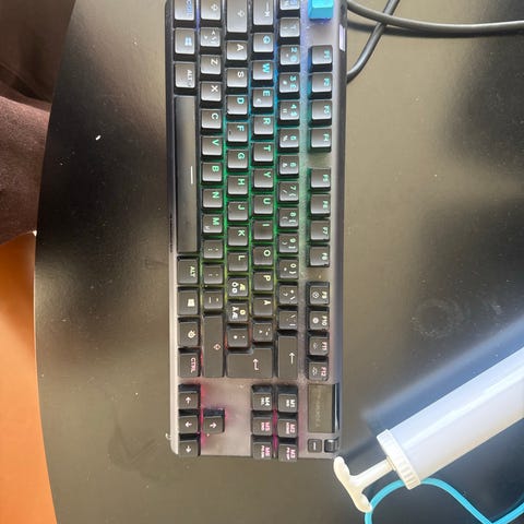 Tastaturet er et tenkeyless (TKL) mekanisk tastatur uden numerisk tastatur i højre side. Ifølge mærkaten på undersiden er modellen SteelSeries Apex 7 TKL med røde switches (Red Switch). Tastaturet er kablet og tilsluttes via USB, og der ses to USB-stik på kablet.