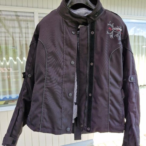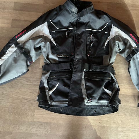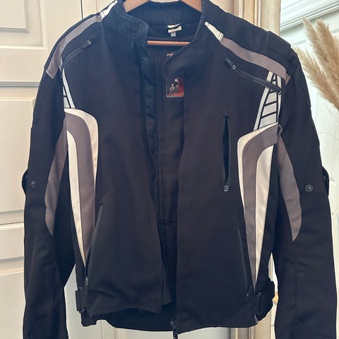 Jakken er designet til motorcykelbrug med lange ærmer og forstærkede syninger samt paneler, der giver bedre pasform under kørsel.