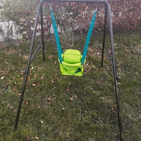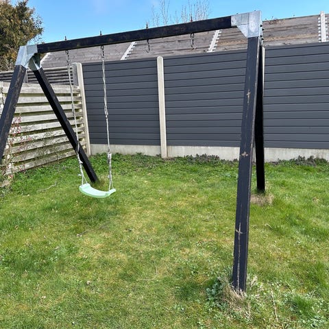Brugt gyngestativ. Inkl. 2 gynger, 1 rutchebane og klatre torv.