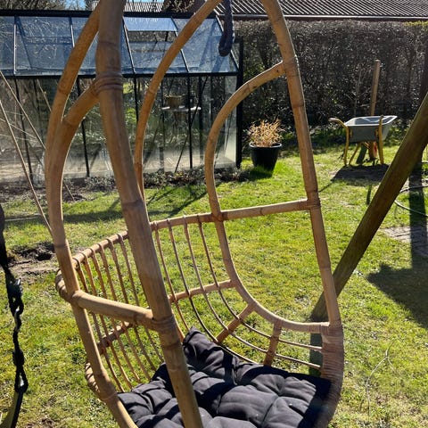 Amazonas hængestol med træstativ i buet design. Stativet er fremstillet i træ og er egnet til udendørs brug i have eller på terrasse. Hængestolen er i forskellige nuancer og ophængt i kæde. Velegnet til afslapning for én person.