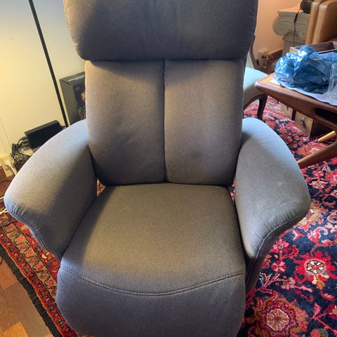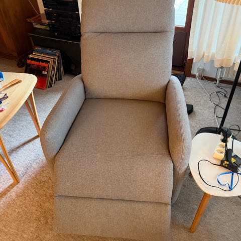 Stolen fungerer fint og kan ses og afprøves Den har utrolig mange indstillingsmuligheder. Med den elektriske betjening kan man rejse stolen op til lodret position, så det er nemt at "komme af den". Den kan stilles så man kan ligge fint i den og tage sin middagslur f.eks.