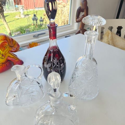 Karaffelsæt bestående af fem klare glas-karaffeler i forskellige former og mønstre. Flere af karaffelerne er mønsterblæste eller slebne med dekorative detaljer, og nogle har tilhørende glasprop. Egnet til servering af vin, spiritus eller andre drikke ved borddækning eller som dekoration. Sælges samlet som sæt.