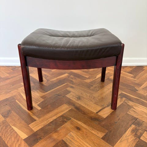 Farstrup skammel med brun læderpolstret pude og massivt træstel i mørk finish. Skamlen har let buet sæde for øget komfort og fire ben, der giver stabilitet. Velegnet som fodskammel til lænestol eller som ekstra siddeplads i stue eller opholdsrum. Mærkat fra Farstrup er monteret på stellet. Læderet fremstår med patina.