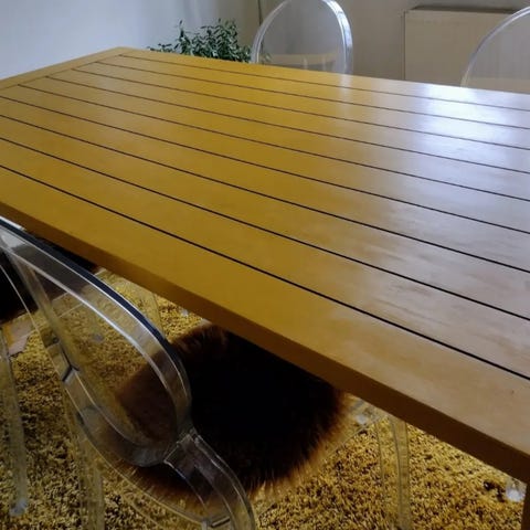 Har ikke mål måske 2,4 meter langt. Står usamlet, ben skal skrues på. Mærke og tusch på bordplade.