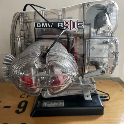 Model af 4-cylindret motor fra Franzis i gennemsigtig plast. Virker.