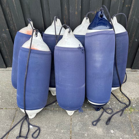 Båd fendere i plast i blandede størrelser. Fendersættet består af hvide og sorte fendere med sort top og øje til fastgørelse af tovværk. Velegnet til beskyttelse af bådsiden ved fortøjning langs kaj eller andre både. Materiale: plast. Farver: hvid og sort.