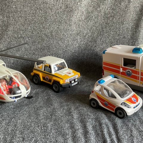 Playmobil City Life redningshelikopter legetøjssæt med helikopter, landingsplads og figurer. Sættet indeholder en hvid og orange redningshelikopter med bevægelige rotorblade samt en landingsplade. Medfølgende tilbehør omfatter tre Playmobil-figurer i rednings- og pilotudstyr, båre, medicinsk udstyr og små dele til redningsscenarier.