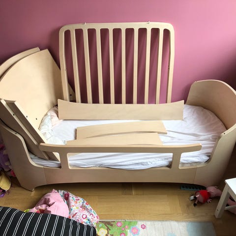 tremmer følger med så den kan gøres til tremmeseng. Det er den gamle model juno, så bunden kan ikke hæves