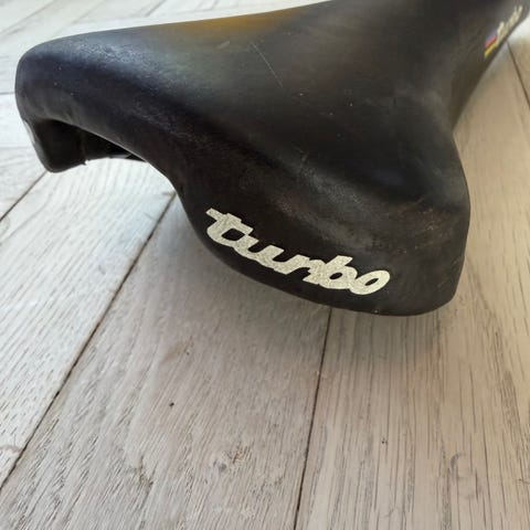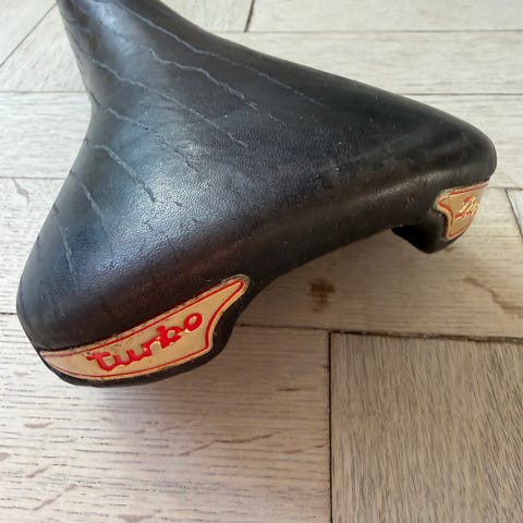 Sadel, Bio Turbo, Selle Italia Bio Turbo vintage sadel i læder og i meget fin stand uden huller. Den er fra ‘87 og har kun kørt om sommeren. Har ligget på lager i mange år og har et par trykmærker, der dog nok retter sig ud når den bliver brugt igen. Sjældent set til salg. Sender gerne.