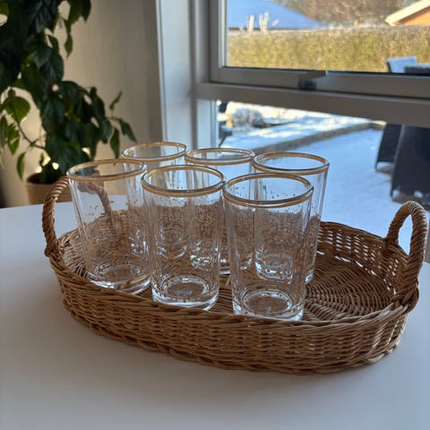 Sættet består af to høje drikkeglas i klart glas med guldfarvet kant foroven og guldfarvet bund.