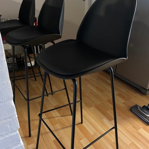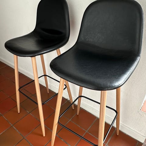 Stolene er i sort kunstlæder med ben i egetræslook. De er meget komfortable og passer perfekt til køkkenø eller barbord.