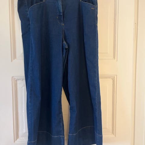 Munthe bukser i denim til kvinder i str. 40. Bukserne er blå og fremstillet i denim-materiale. Modellen har synlige stikninger, bæltestropper og lukning med knap og lynlås foran. Velegnet som hverdagsbukser eller til mere afslappede anledninger.