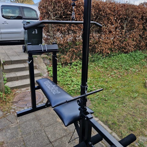 Træningsbænk inkl. trækstation, bentræner & div. grbe
