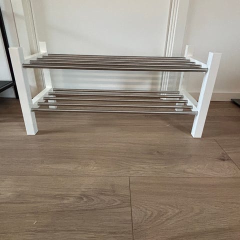 IKEA skoreol med 2 hylder. Reolen har hvide gavle og hylder med metalstænger. Velegnet til opbevaring af sko i entré, garderobe eller bryggers.