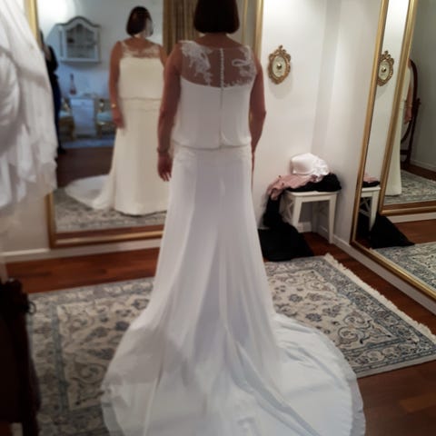 White One med de smukkeste blonder. Kjolen har lille slæb
