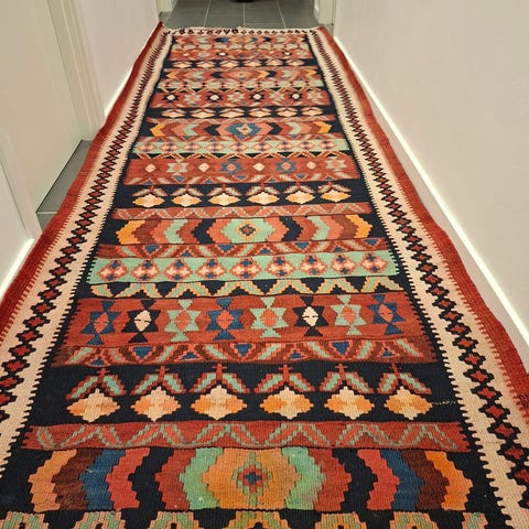 Løber, Uld, b: 80 l: 295, Patchwork Kelim. Fin stand. Et lille område af tæppet er "gået op" i vævningen/syningen (vist på det ene af billederne). Kan evt. "syes fast" på underlaget, så det ikke går yderligere op. Fra ikke-ryger hjem. Købt i Illums Bolighus i sept. 2010. Kvittering haves.