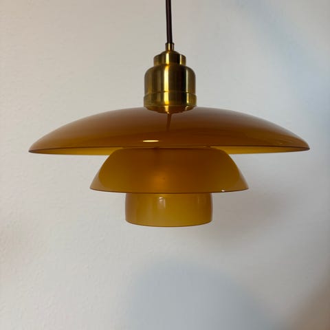 Gul pendel lampe. Der sidder lidt brun tape fast på indersiden af lampen (se billede). Er ikke forsøgt fjernet. Kan helt sikkert fjernet med rensebenzin e.l.
