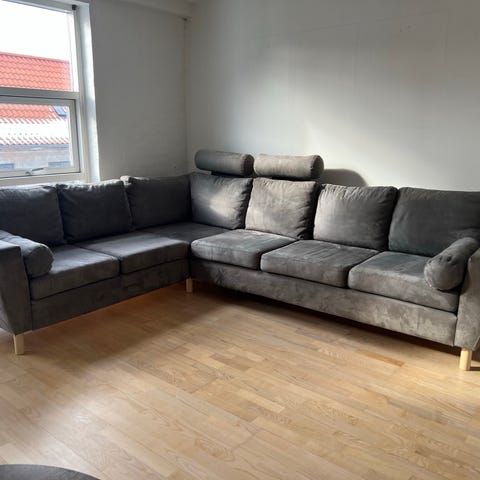 Fin sofa fra Ilva i blå. Fra 2022. Der er tilhørende puf. Opbevaring i armlæn og under det yderste sæde.