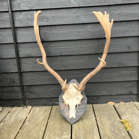 Trofæ og opsatse til ophæng på væg. Sættet omfatter et større skuldermonteret bless buck samt flere mindre opsatse. Egnet som dekoration i eksempelvis jagtstue, stue eller gang. Materiale består af ægte kranier og horn samt monteringsplader i træ.