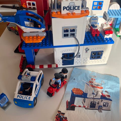 LEGO DUPLO City politisæt. Sættet består af en lille politistation med port og bom samt en politibil og tilhørende DUPLO-figurer/klodser.