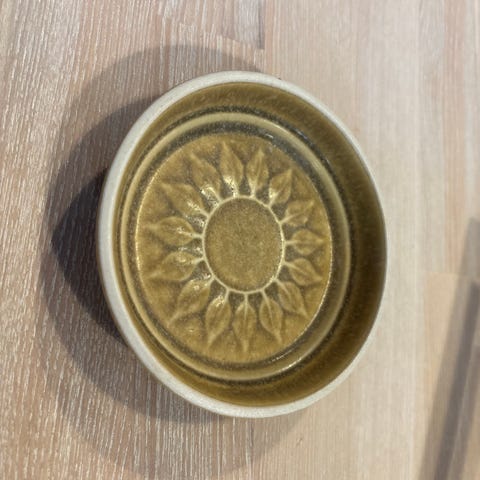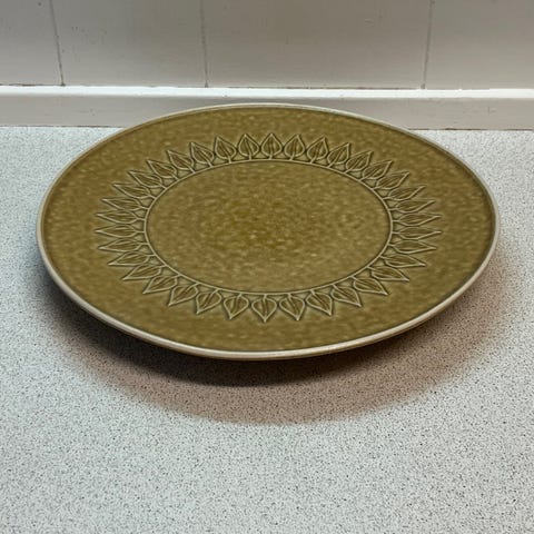 Tre fade i stentøj model relief designet af Jens H. Quistgaard. Måler cirka 15 x 16 cm. Produceret hos Kronjyden og Bing & Grøndahl. Disse er produceret hos Kronjyden. Der i en periode kun mørkeste med sølvfarvede klistermærker under bunden.