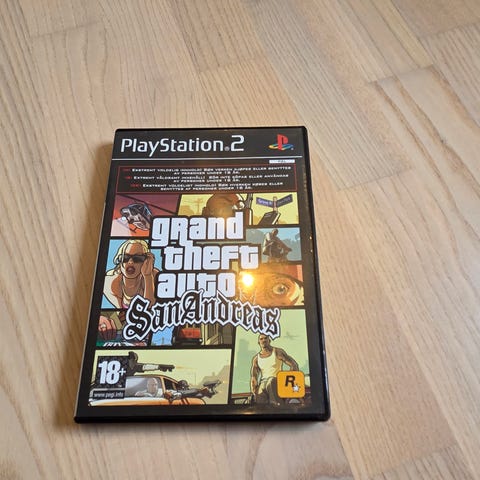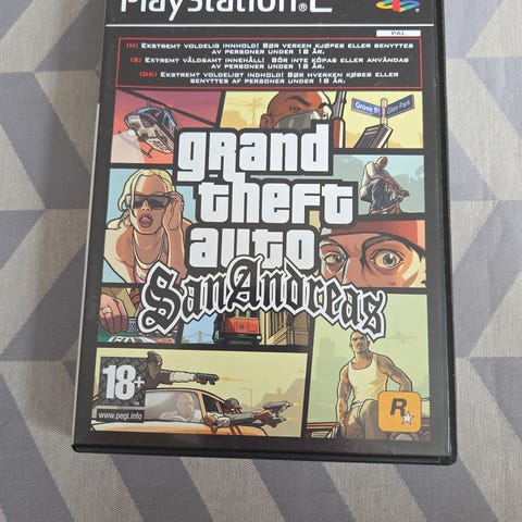 Rockstar Games Grand Theft Auto: San Andreas Playstation 2 spil. Action-adventurespil på DVD-medie til Playstation 2-konsol. Forsiden angiver aldersmærkning 18+. Udgaven er markeret som Platinum-version. Leveres i original plastboks med trykt omslag og spil-disk med motiv fra spillet. Velegnet til brug på kompatible Playstation 2-systemer.