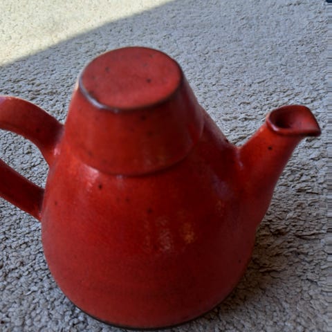 Retro Tekande og kande med tilhørende aflangt fad i keramik. Ydersiden er sort og indersiden samt låg og fad er gule. Tekanden har hank i flet og står på små fødder. Sættet kan anvendes til servering af te, kaffe, mælk eller fløde samt til mindre anretninger på bordet.