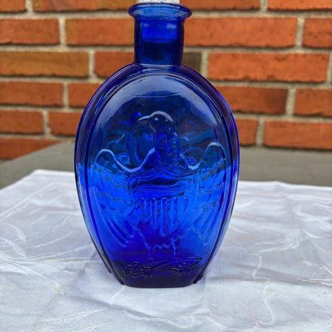 Vintage grønlig jagtflaske med en ørn på den ene side og et horn med frugt på den anden side.