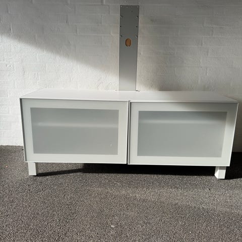 Væghængt TV møbel fra IKEA BESTÅ i hvid træ. Skab med hylde og låge i hver ende samt central skuffe og hylde. Masser af opbevaringsplads og huller til kabelføring til TV, PlayStation, højtalere osv. Hylderne i skabene er flytbare og kan tilpasses efter behov. Er brugt få år og er yderst velholdt uden ridser. Sælges pga. flytning.