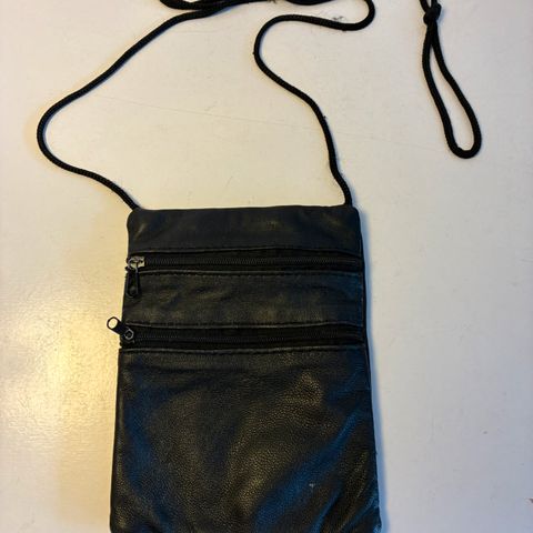 Pung, Pengekat, Lysebrun skind/læder taske / pung med justerbar halsrem på max 110 cm. Der er silkefoer indeni. Måler 15 x 12,5 cm.