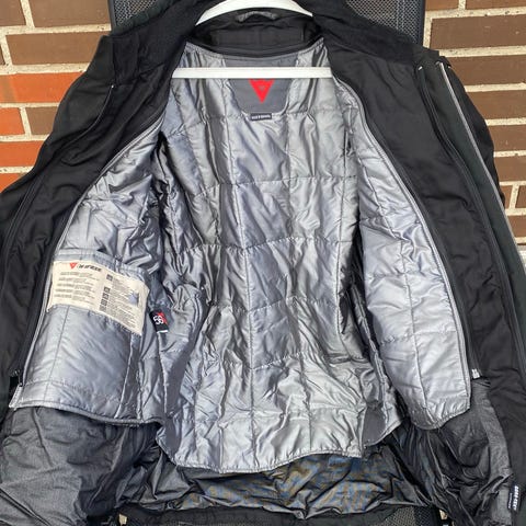 Dainese motorcykeljakke i tekstil i sort og grå. Jakken har høj krave, lynlås med udvendig vindstolpe og trykknapper. Der er brystlomme og sidelommer med lynlås samt justeringsmuligheder i livet og på ærmerne. Ærmerne har indsatser i kontrastfarve og der er Dainese-logo på overarmen og ryggen. Jakken er foret med aftageligt for og egnet til motorcykelbrug med fokus på synlighed og komfort under kørsel. Der er skulder-, ærme-, og rygskjold indbygget i jakken.