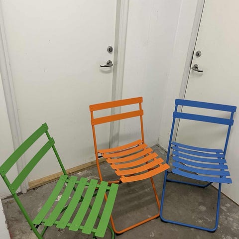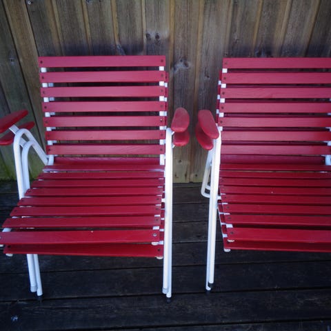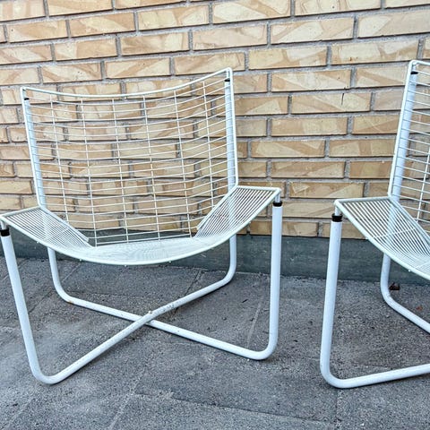 2 spagetti havestol - stellet er i fin. Stand, den ene. Har et brud på snoren.