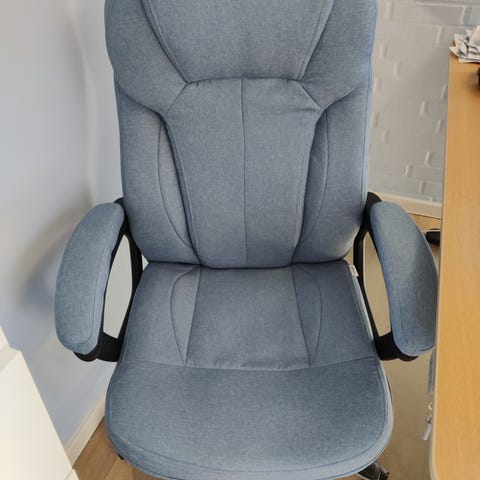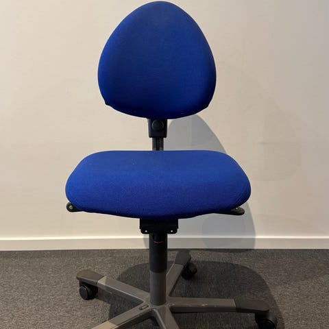 Kontorstol med høj ryg og integreret nakkestøtte. Sæde og ryg er polstret og betrukket med blå stof. Stolen har justerbare armlæn og femstjernet fod med hjul i sort plast. Velegnet til brug ved skrivebord eller kontorarbejdsplads.