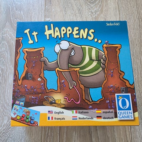 Shit Happens brætspil på dansk. Kortbaseret selskabsspil hvor spillerne rangerer forskellige uheldige situationer efter et elendighedsindeks. Egnet som underholdning til voksne og større unge i sociale sammenhænge som fester eller spilaftener.