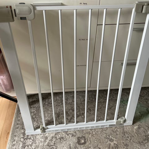 Sikkerhedsgitter i metal i farverne hvid og sort. Gitteret består af lodrette tremmer og er egnet til afskærmning af døråbninger eller trapper for børn eller kæledyr. Det kan typisk monteres mellem vægge eller dørkarme ved hjælp af beslag. Velegnet til indendørs brug, hvor der er behov for at begrænse adgang til bestemte områder.