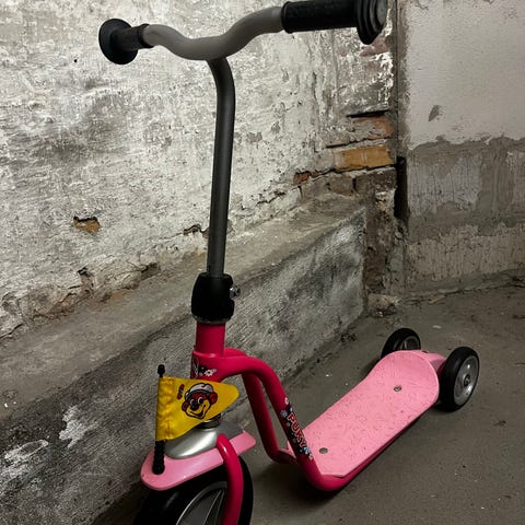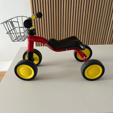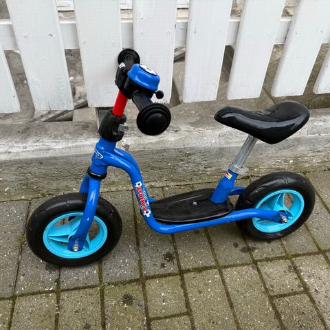 Puky løbecykel til små børn i blå med sort sæde. Modellen har fire hjul for ekstra stabilitet og et lavt sæde, der gør det nemt for barnet at komme af og på. Styret har greb med endestop for bedre håndtering. Egnet som første køretøj til mindre børn, der skal øve balance og koordination.