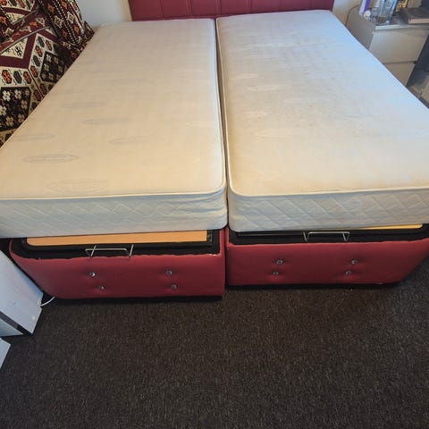 2 enkeltsenge (sengestel) i rokokostil sælges samlet - nyligt ompolstret i gråbeige stof. Mål: 90x200 cm x 2 stk. højeste gavl er 85 cm høj. Kan adskilles. Box madrasser kan tilkøbes for 300 kr pr stk