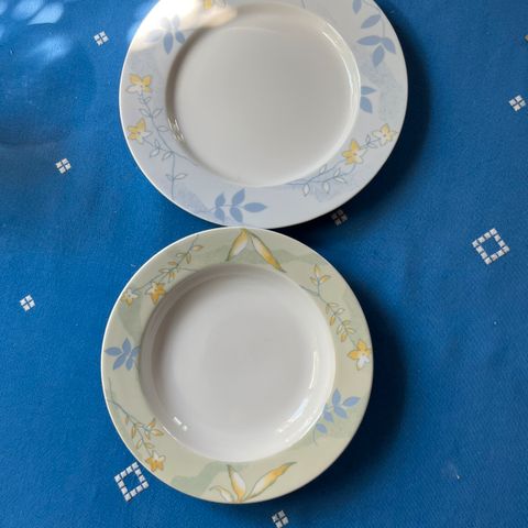 Rusta tallerkener og skåle med blomstermotiv. Stellet er i hvidt porcelæn med gul kant, blomsterdekoration og farvede firkanter langs kanten. Sættet omfatter flade tallerkener samt dybe skåle, som kan anvendes til fx middagsretter, suppe eller morgenmad. Velegnet som hverdagsstel eller ekstra stel til gæster.