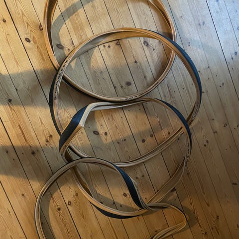 Conti GP 5000 25 mm par brugt ca 7-800 km så dem har nok mønster.